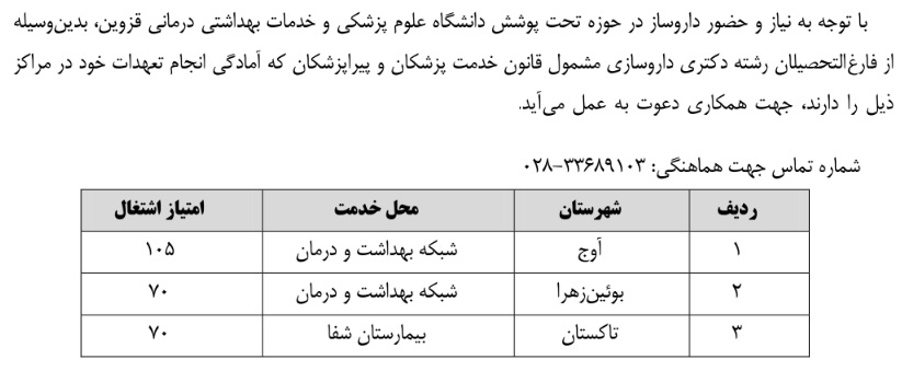 جذب نیروی داروساز مشمول قانون خدمت ۲۵ آذر ۱۴۰۴ | ۰۹:۰۰ کد : ۵۷۰۵۷ اطلاعیه ارسال به دیگران نام شما ایمیل شما ایمیل دریافتکننده ارسال انصراف تعداد بازدید:۵۸۵ جذب نیروی داروساز مشمول قانون خدمت در دانشگاه علوم پزشکی قزوین